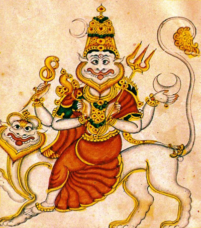 above) is painted as a decorative motif on the ceiling of the Nandi mandapam of Thanjavur Brihadiswara temple. Gandabherunda का एक अन्य हड़ताली छवि (ऊपर दिखाए गए) तंजावुर Brihadiswara मंदिर के नंदी मंडपम की छत पर एक सजावटी आकृति के रूप में चित्रित है.